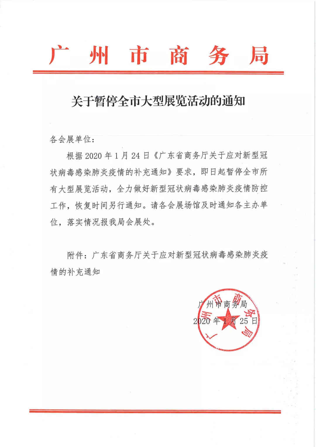 針對目前“新型冠狀病毒”的疫情防控要求,接廣州市商務局《關于暫停全市大型展覽活動的通知》,即日起暫停全市所有大型展覽活動,全力做好新型冠狀病毒感染肺炎疫情防控工作。為保障廣大展商和觀眾的健康,保證展覽會的展出效果,原定于2020年2月9-11日在廣州市保利世貿博覽館舉辦的“第23屆迪培思廣州國際廣告標識及LED展”將延期舉辦,具體恢復時間將根據形">