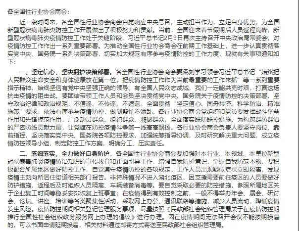 意見指出,各全國性行業(yè)協(xié)會商會要加強對本行業(yè)、本領(lǐng)域、本單位新型冠狀病毒肺炎疫情防治知識的宣傳教育和正面引導(dǎo)工作,增強自我防護意識,掌握自我防范本領(lǐng)。在疫情得到有效控制之前,一般不得舉辦年會、展會、研討會、論壇、講座、培訓(xùn)等各類聚集性活動,采取網(wǎng)上辦公、通訊聯(lián)絡(luò)等措施,減少人員流動,降低疫情發(fā)生風(fēng)險。疫情防控期間相關(guān)登記管理服務(wù)事項,盡量按照《民政部社會組織管理局關(guān)于在疫情防控期推行全國性社會組織政務(wù)服務(wù)網(wǎng)上辦理的倡議》進行辦理。因在疫情期間無法召開會議不能按期換屆的,可以書面申請延期換屆。