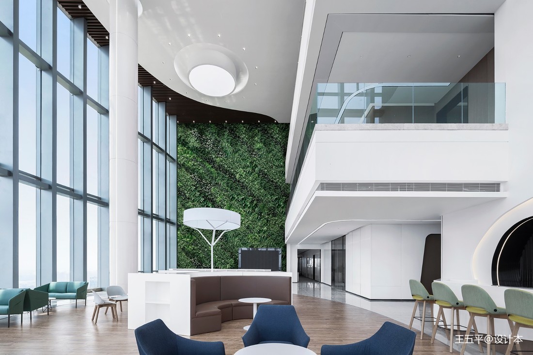 本項目盤踞于南寧市五象新區,恢弘大氣。室內辦公大堂則延續了建筑風格,糅合了科技與藝術的理念,以創新的手法抒寫現代化辦公國際風貌。中空大堂的室內有三層之高,四周柱子撐起了豪邁的空間風骨,設計以白色為主色,搭配以綠、藍、褐,藉由造型和色彩的純粹性,帶來無與倫比的審美享受。
